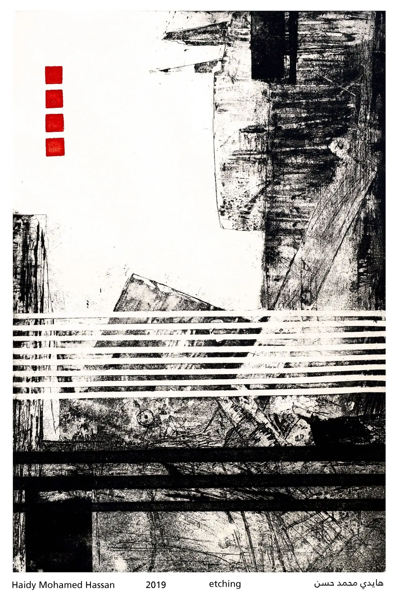 Inspired by the aged textures and fragmented rhythms of Cairo’s old streets, Antibodies transforms urban decay into abstract compositions of black and white etched surfaces. Each print captures a dialogue between erosion and endurance —where the red rectangle punctuates the scene as a symbol of resistance, vitality, and renewal.